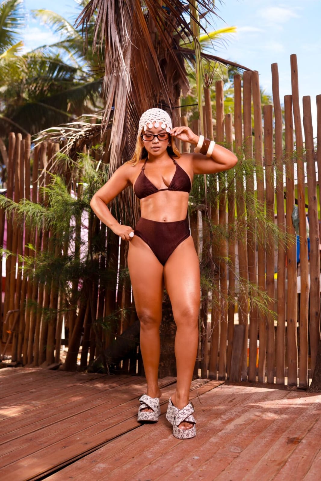 A textura do tecido dá um toque sofisticado ao look, enquanto a cor marrom traz elegância e combina perfeitamente com dias de praia, piscina ou resort.